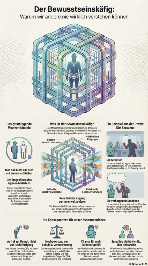 In dieser Sichtweise wird auch deutlich: Der Versuch, andere zu „verstehen“ oder gar moralisch zu beurteilen, ist notwendigerweise durch unseren eigenen Bewusstseins-Käfig gefiltert. Wir können andere nur in dem Maße verstehen, in dem ihre Erfahrungen, ihre emotionalen Reaktionen und ihre Verhaltensmuster überhaupt anschlussfähig für unsere eigene Innenwelt sind.