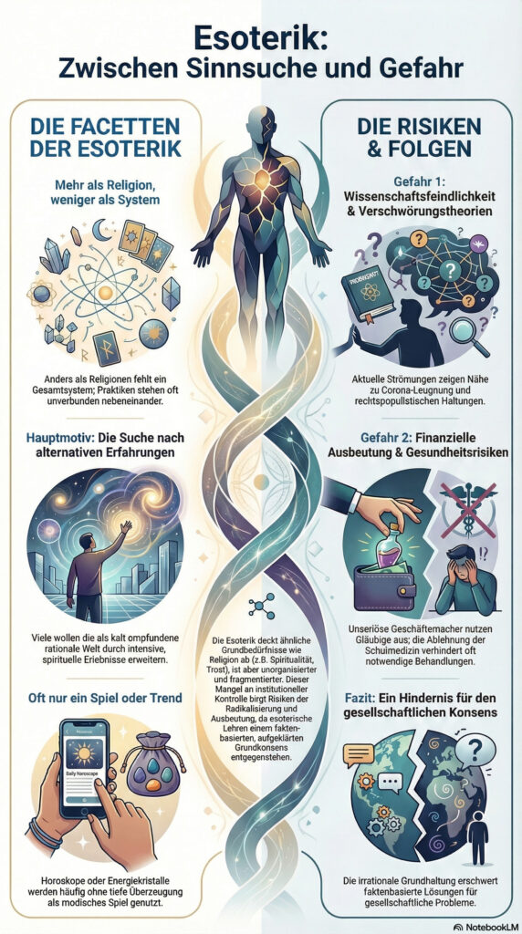 Unterm Strich bleibt Esoterik – gesellschaftlich betrachtet – mehr als ein beliebiger Zeitvertreib oder eine harmlose Spinnerei. Esoterik ist verbunden mit einer wissenschaftsskeptischen bis -feindlichen Haltung, die einem faktenbezogenen und aufgeklärten Grundkonsens in unserem Zusammenleben entgegensteht. Sie erschwert die Verständigung auf solche Formen von WELTGESTALTUNG, die auf der Anwendung von allgemein überprüfbarem Wissen beruhen.