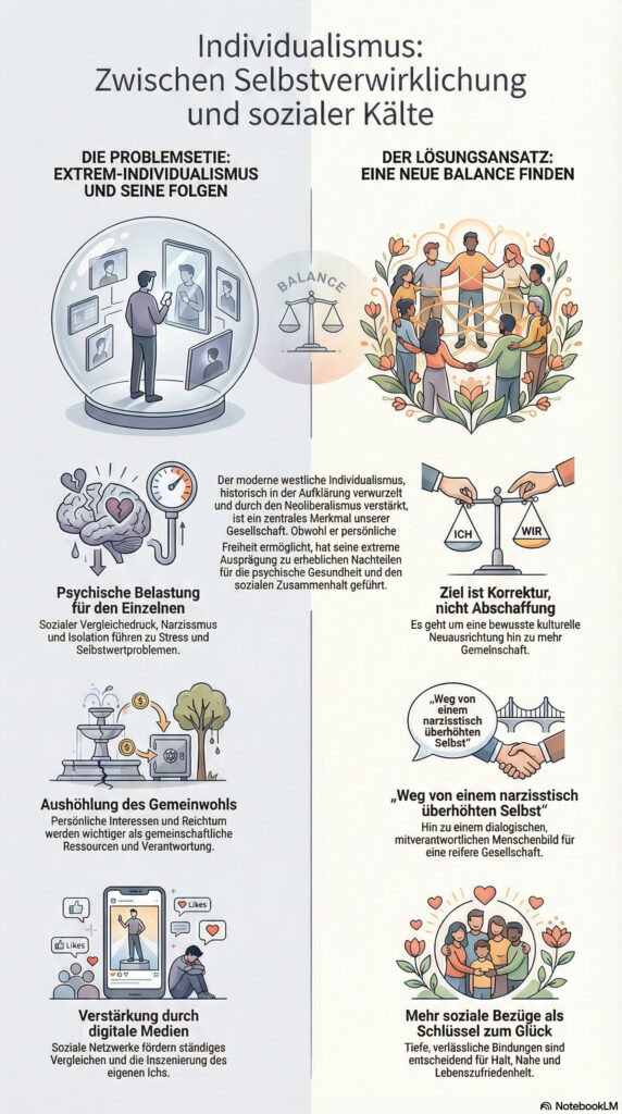 Es geht nicht darum, das Individuum zu entwerten oder in autoritäre Kollektive zurückzukehren. Aber es braucht eine bewusste kulturelle Korrektur: weg von einem narzisstisch überhöhten Selbst, hin zu einem dialogischen, mitverantwortlichen Menschenbild. Ein gesundes Gleichgewicht zwischen Autonomie und Einbindung, Selbstverwirklichung und Gemeinsinn ist kein Rückschritt, sondern eine überfällige Reifung moderner Gesellschaften.