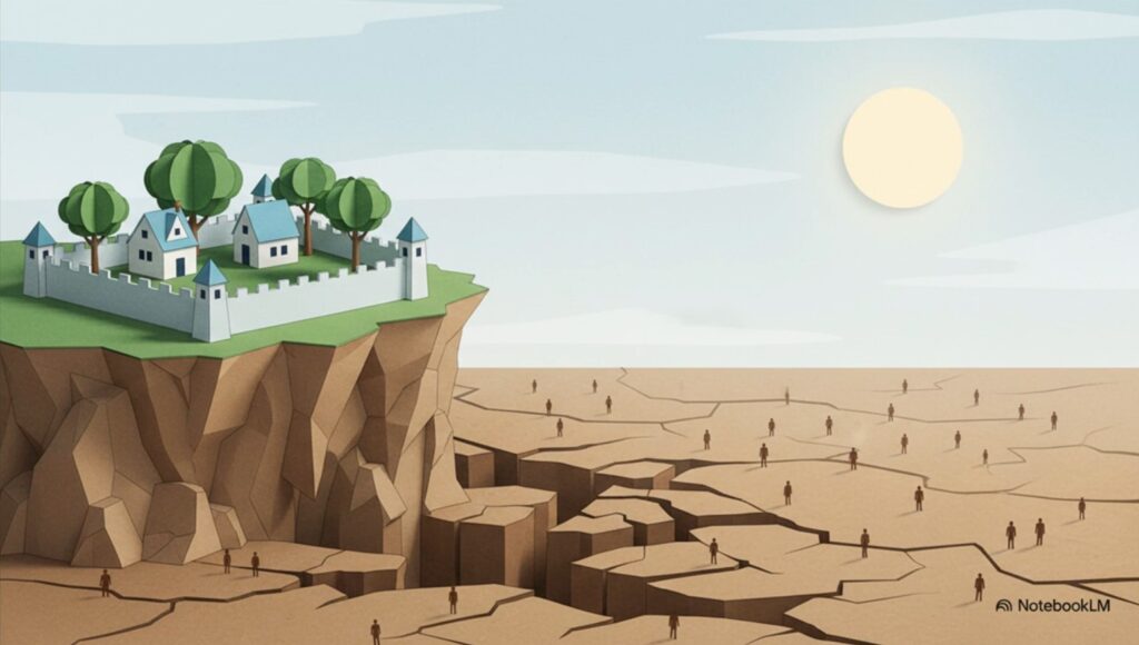 Dafür sprechen u.a. 2 Gründe: Einmal wird es geografische Bereiche auf diesem Planeten geben, die von den drastischen Klimaveränderungen profitieren werden – z.B. durch verbesserte Bedingungen für die Landwirtschaft. Zum anderen werden sich sehr wohlhabende Kreise Rückzugs-Oasen leisten können, in denen sie den veränderten Bedingungen unter angenehmsten Bedingungen trotzen können. Solche Refugien werden bereits gebaut und für Hunderte von Millionen erworben.