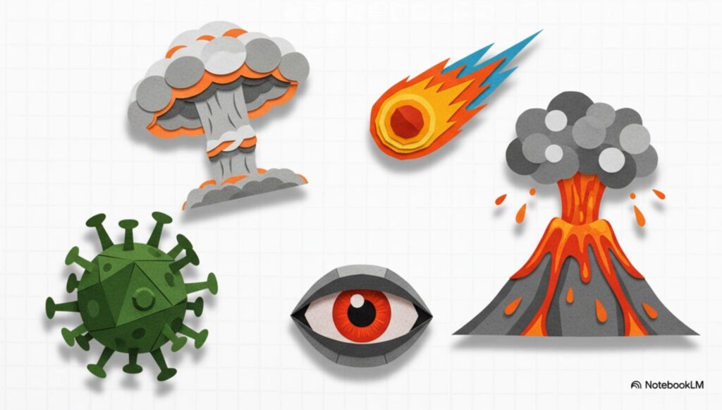 Kandidaten dafür sind allseits bekannt: ein (gewollter oder versehentlicher) nuklearer Schlagabtausch, eine tödliche Pandemie, ein freigelassener Bio-Kampstoff, der Ausbruch eines super-Vulkans, ein Meteoriten-Einschlag, eine auf Vernichtung programmierte KI. Die Wahrscheinlichkeits-Werte für all diese Ereignisse sind zwar ziemlich niedrig, aber ganz sicher nicht bei Null.