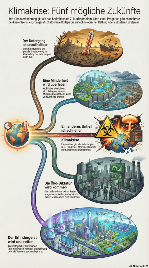 - Welche alternativen Bedrohungen zur Klimakatastrophe werden im Szenario „Ein anderes Unheil wird schneller sein“ genannt?