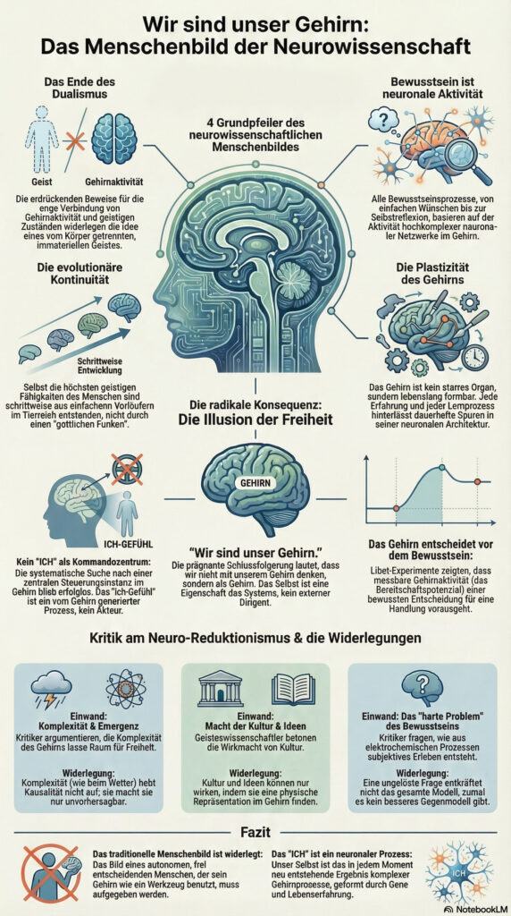 Die vielleicht provokanteste Konsequenz des neurowissenschaftlichen Menschenbildes ist die fundamentale Infragestellung traditioneller Konzepte von „ICH“ und „freiem Willen“. Die Erkenntnisse der Hirnforschung legen nahe, dass unser intuitives Gefühl, ein autonomer Akteur zu sein, der sein Gehirn wie ein Werkzeug benutzt, einer genaueren Prüfung nicht standhält.