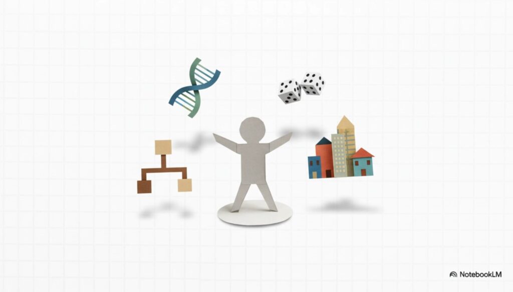 - (Epi-)genetische, biologische, familiäre, soziale und kulturelle Einflüsse: Verschiedene Faktoren, die die Entwicklung und Prägung eines Menschen stark und nachhaltig beeinflussen und die oft außerhalb der eigenen Kontrolle liegen.