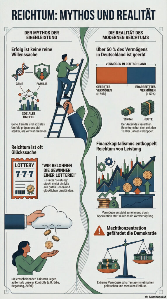 - Die Faktoren, die für den Zugang zu Reichtum in unserer Gesellschaft verantwortlich sind, liegen weitestgehend außerhalb der eigenen Kontrolle. Dazu gehören u.a.: Hineingeborenwerden in eine reiche bzw. bildungsnahe Familie; ererbtes Vermögen; besondere Begabungen; die biologischen und früh erworbenen Grundlagen für Fleiß, Selbstdisziplin und Selbststeuerung; fördernde Lebensereignisse oder soziale Begegnungen, alle erdenklichen Zufälle, die dazu führen, dass z.B. eine bestimmte Idee oder eine geschäftliche Entscheidung zu einem wirtschaftlichen Erfolg führen.