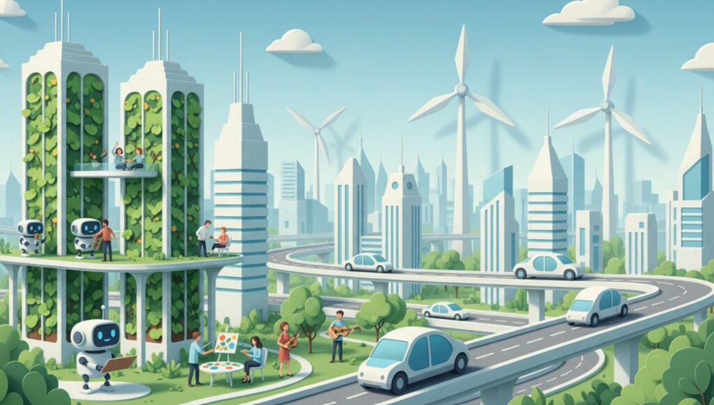 Staatlich geförderte „Green Jobs“ in Renaturierung, Energiesanierung und ökologischer Landwirtschaft schaffen 12 Millionen neue Arbeitsplätze in der EU. Arbeitszeitkonten ermöglichen flexible Modelle zwischen 15 und 35 Wochenstunden, gekoppelt an individuelle CO2-Bilanzen. KI-Systeme dienen primär der Optimierung von Materialströmen, während menschliche Arbeit auf kreative und empathische Tätigkeiten fokussiert bleibt.