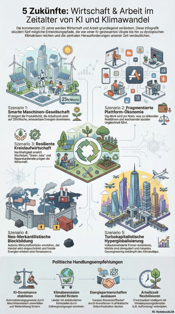 Die kommenden 25 Jahre werden die globalen Wirtschaftsstrukturen und Arbeitsmärkte durch das Zusammenspiel von technologischem Fortschritt, Klimawandel und geopolitischen Verschiebungen grundlegend transformieren. Dieser Bericht skizziert fünf mögliche Entwicklungspfade, die von einer vollständigen Integration künstlicher Intelligenz (KI) bis hin zu dystopischen Klimakrisenszenarien reichen. Basierend auf aktuellen Prognosen des Sachverständigenrats für Wirtschaft, Zukunftsstudien zur Arbeitswelt und Klimafolgenanalysen werden folgende Kernaussagen deutlich: Die wirtschaftlichen Kosten des Klimawandels könnten bis 2050 globale Einkommensverluste von 19 % verursachen, während gleichzeitig KI-basierte Automatisierung sowohl Produktivitätsgewinne als auch strukturelle Arbeitsmarktverschiebungen bewirken wird. Die Energieversorgung wird zum entscheidenden Faktor für Wettbewerbsfähigkeit, und Arbeitszeitmodelle müssen sich an veränderte Produktionsbedingungen anpassen.